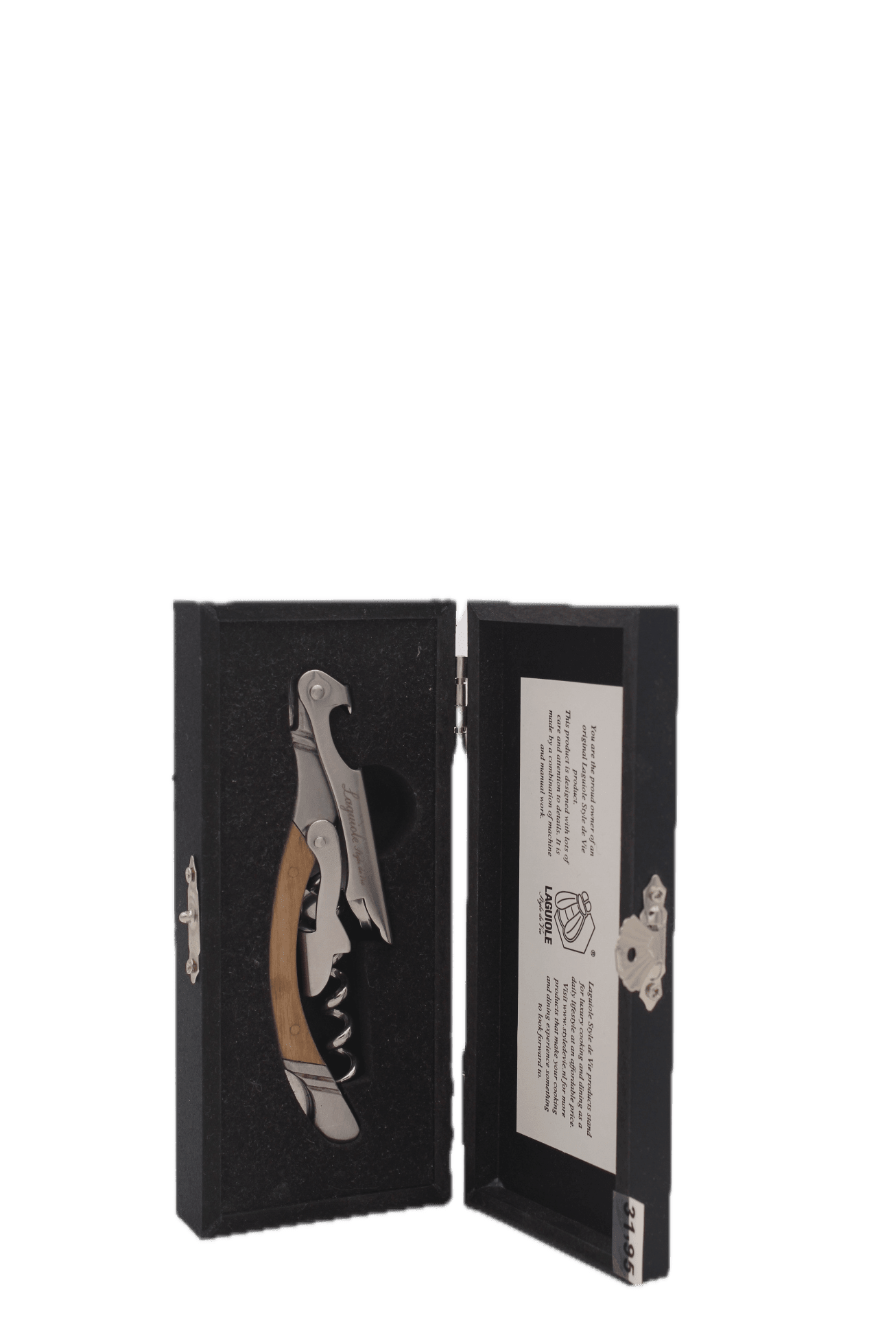 Het meest opvallende kenmerk van deze kurkentrekker is het handvat, vervaardigd uit prachtig olijfhout. Dit hout heeft een warme, zachte en fijne uitstraling en voegt een vleugje verfijning toe aan het algehele ontwerp. Het olijfhouten handvat is met uiterste precisie bewerkt. Zo vormt het een harmonieus contrast met de roestvrijstalen kurkentrekker van deze Laguiole.
